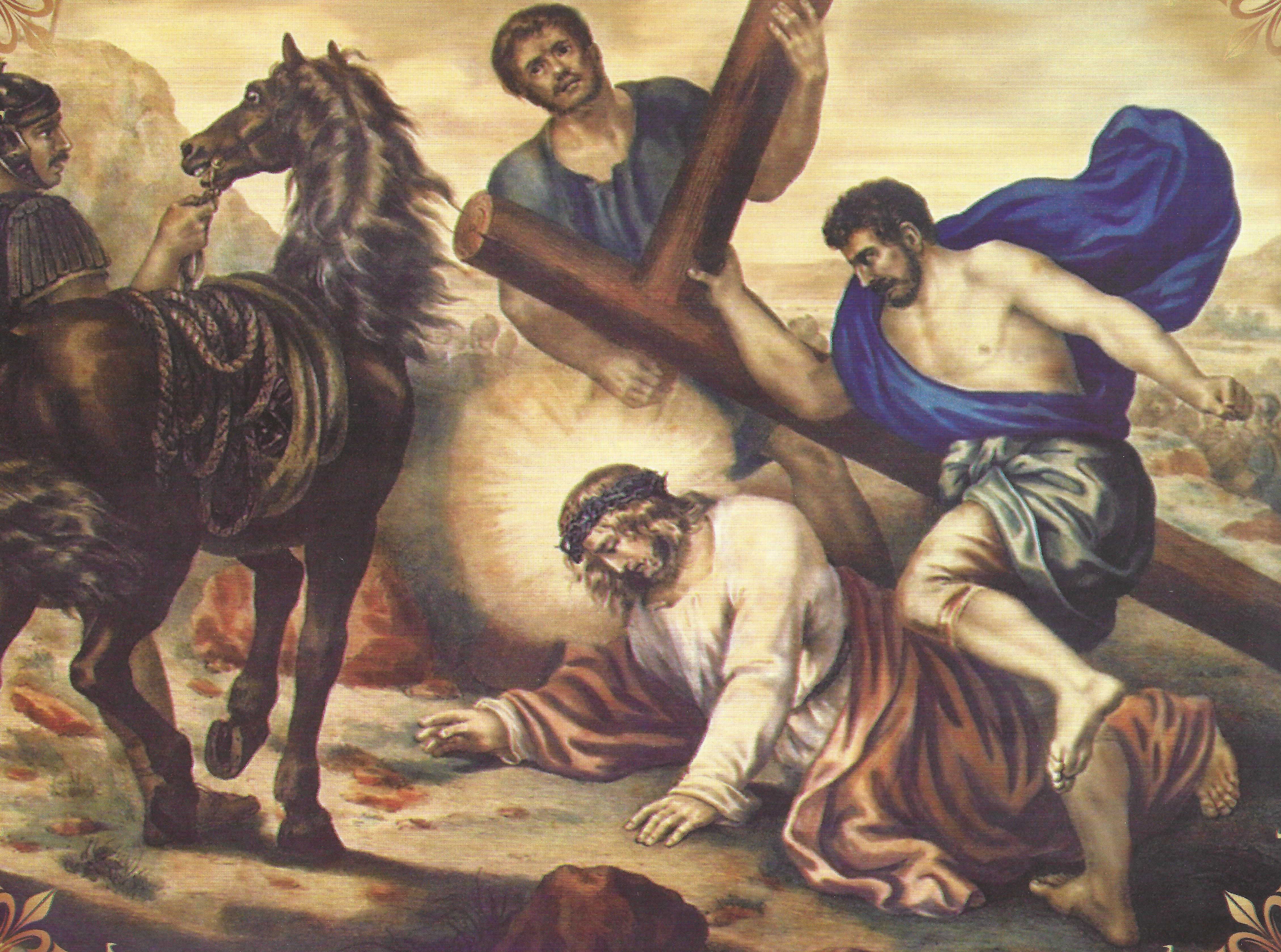 cerca del Calvario, simbolizando el peso de las caídas humanas, la trai-